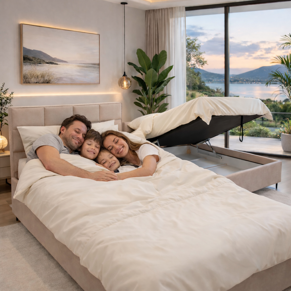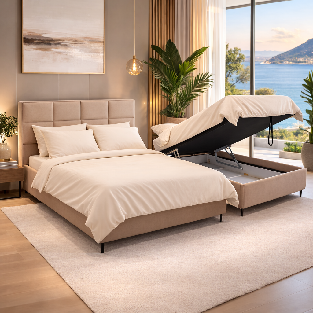 מיטה מעוצבת ונוחה במיוחד המגיעה עם ארגז מצעים מובנה לאחסון חכם ונוח.